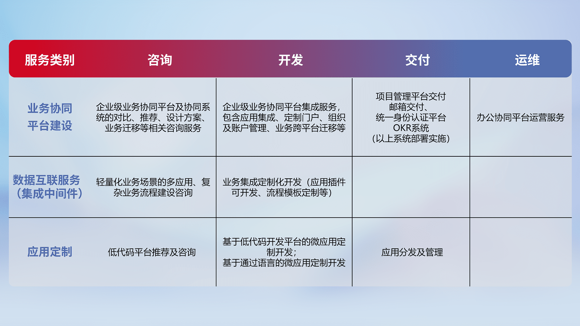 针对钉钉、、企微、、、IDaas等平台级产品提供产品的规划、、、、方案、、交付、、定制化开发等服务,,,,实现如统一协同办公、、智能客户服务、、、混合会议管理、、、智能数据查询、、、等业务场景,,,实现数字化转型。。。